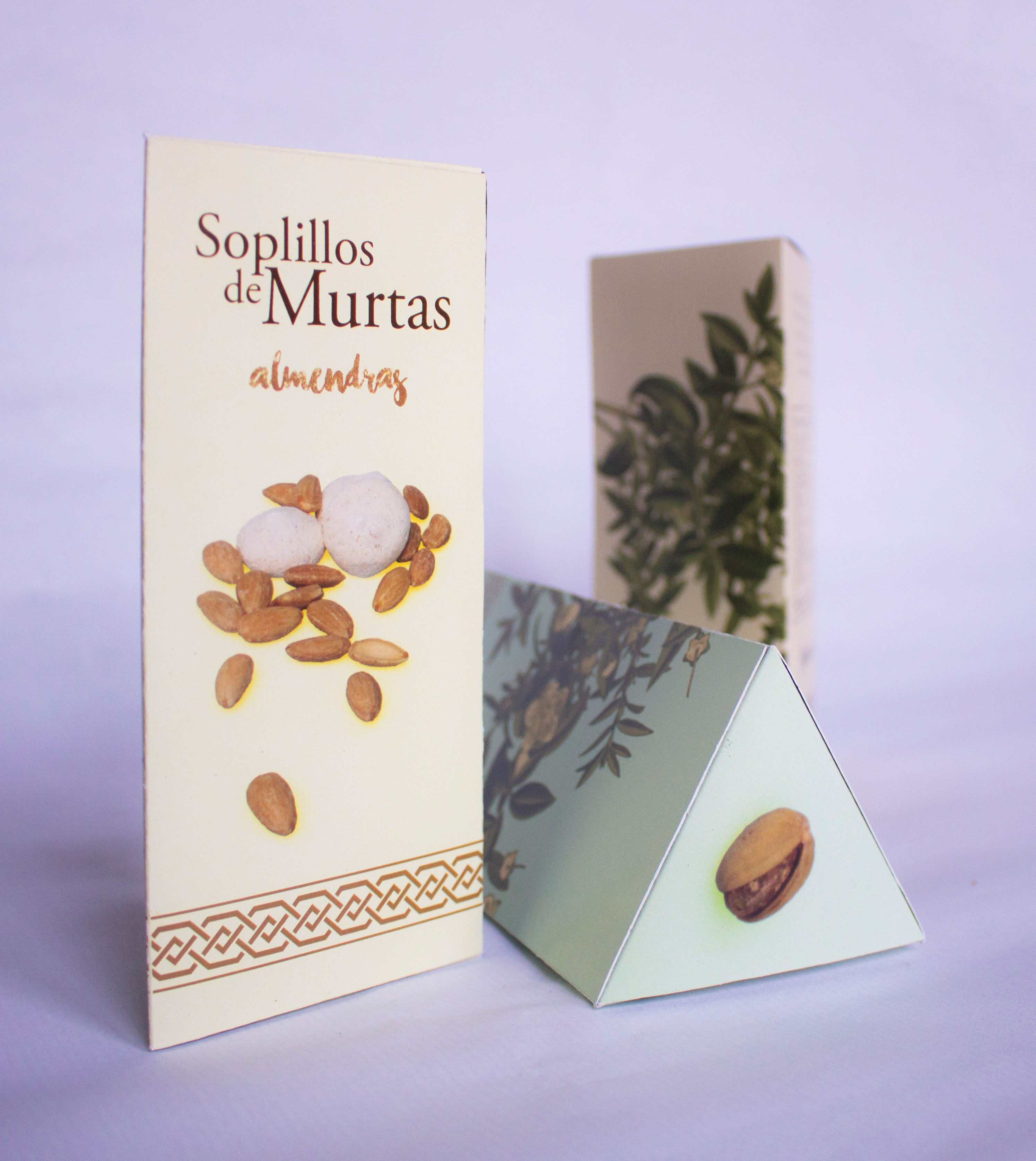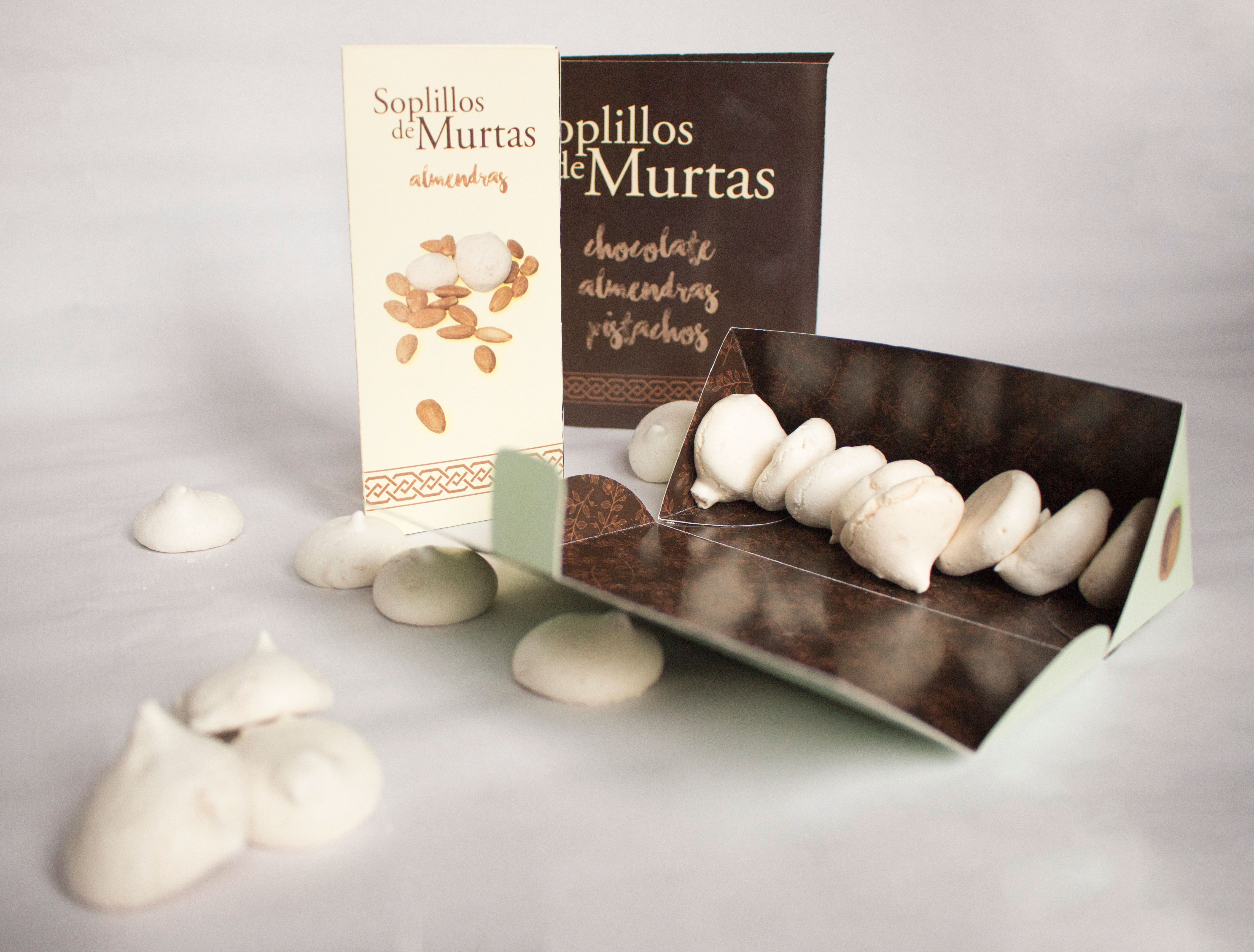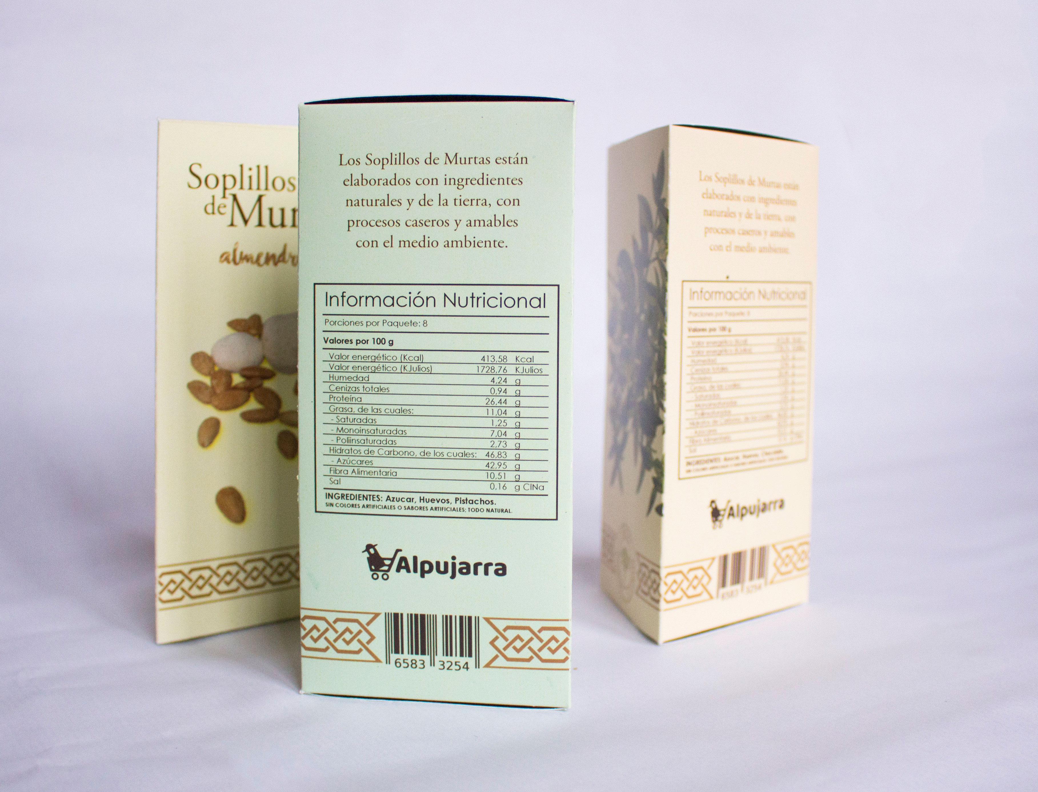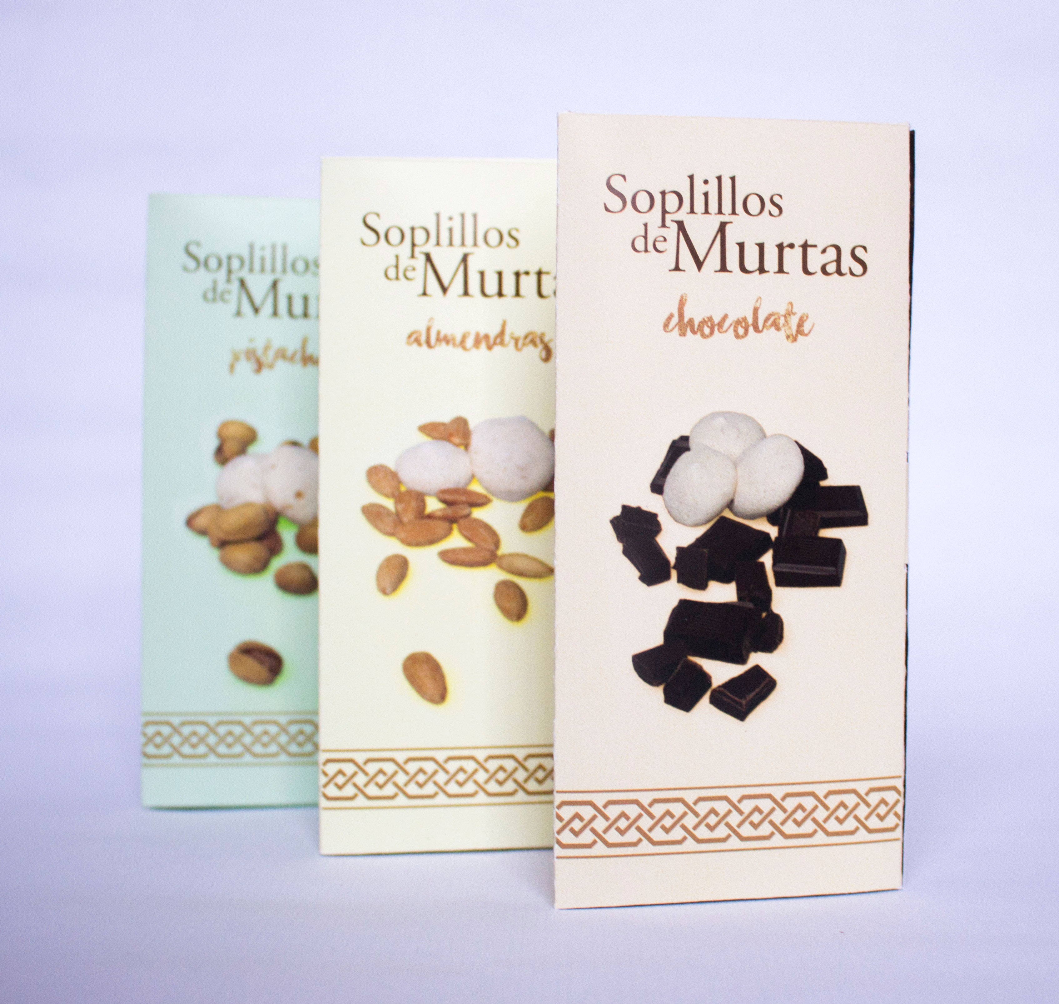 Packaging para los Soplillos de Murtas, típicos dulces de la Alpujarra granadina. Desarrollo de un envase primario o principal así como uno secundario para un pack de soplillos con tres variedades (original, pistacho y chocolate).